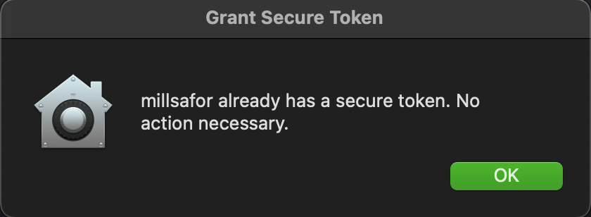 If the currently logged in user does not have a secure token you will be guided through the process to grant one. In order to grant a secure token to a user without one, an account with a secure token must be used. The script will find all secure token users on the system and list them for you. Select an account that you already know the password for.